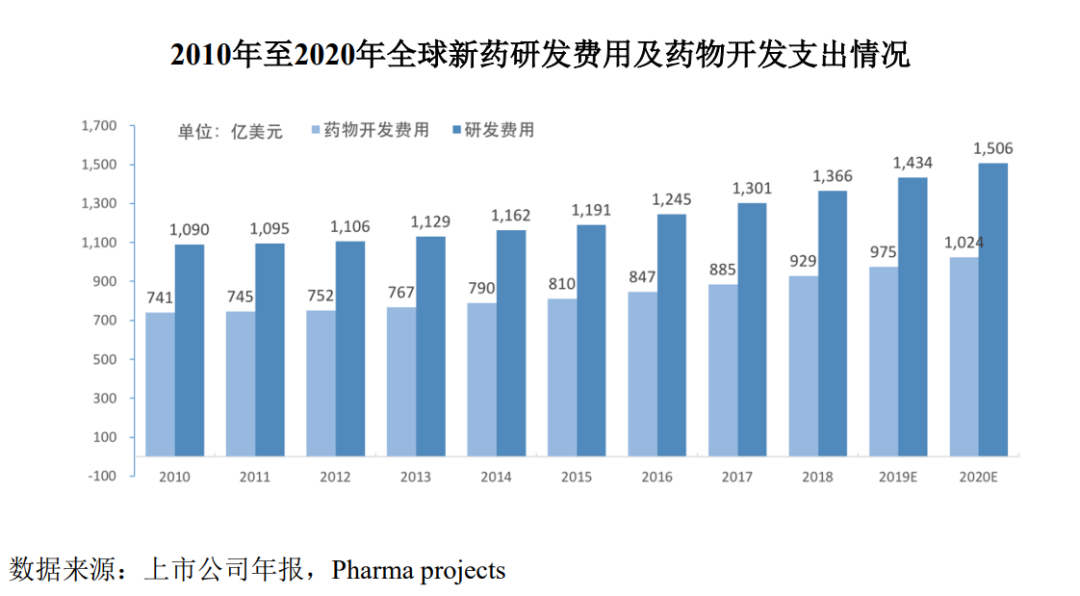 在此基础上,药物研发成本不断提升,全球新药研发投入也随之逐年增加。2010年至2018年,全球医药研发费用由1,090亿美元上升至1,366亿美元。其中药物开发费用由741亿美元上升至929亿美元,占整体研发费用的比例接近70%。预计到2020年,全球生物医药研发费用将达到1,506亿美元,其中药物开发费用达到1,024亿美元,年均增长率约为5%。