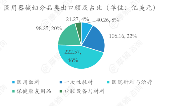 2024年医疗器械出口以医院诊断与治疗用品为主,出口额为222.57亿美元,同比增长6.87%,占比为46%;其次为一次性耗材,出口额为105.16亿美元,同比增长13.91%,占比22%;排名第三的为保健康复用品,出口额为98.25亿美元,占比20%。