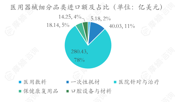 2. 医疗器械类:整体出口额大于进口额,出口细分类目较为均衡,进口医院治疗与诊断产品较多