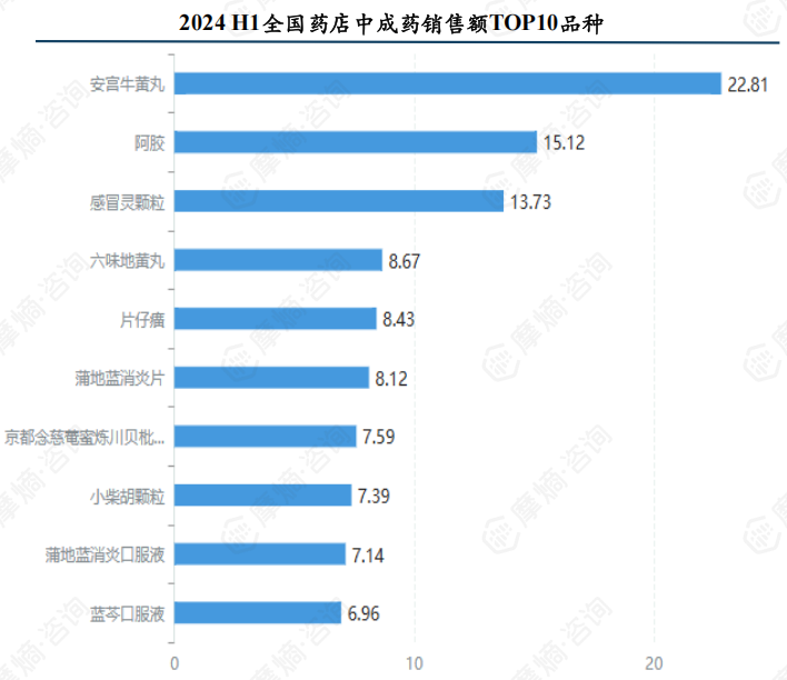 据摩熵医药全国药店零售数据库显示,2024H1销售额排名前十的大品种合计销售额约105.96亿元,占比约12.74%。