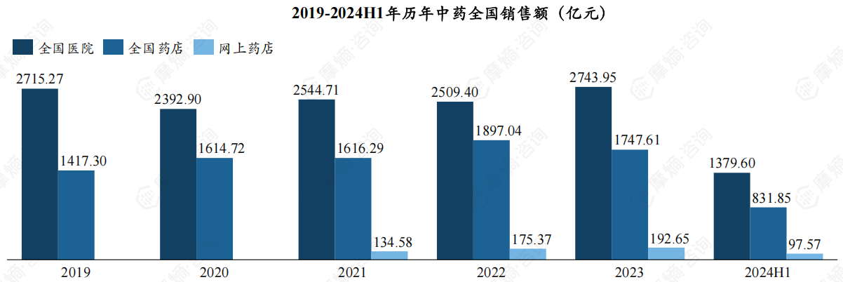 2023年从销售终端来看,全国医院中药市场规模约2743.95亿元,全国药店零售市场规模约1747.61亿元,网上药店销售额约192.65亿元。