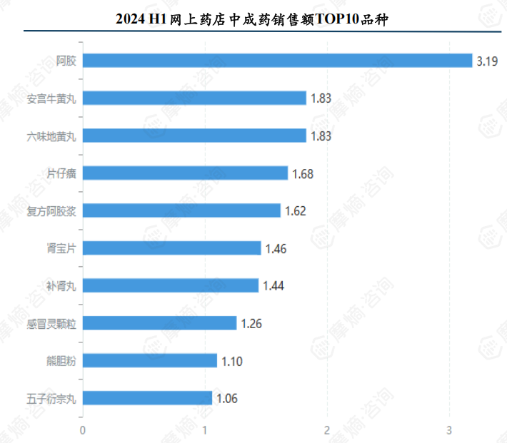 销售额前三的品种分别为阿胶、安宫牛黄丸、六味地黄丸,销售额分别为3.19亿元、1.83亿元、1.83亿元。网上药店销售额TOP10的品种2024H1销售额均已突破1亿元。