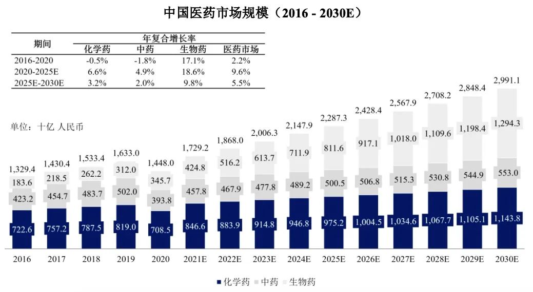 在国内,相比化学药以及中药,生物药增长趋势更加明显。受中国生物药研发投资增加、居民生物药负担能力增强、政府政策利好、肿瘤及自身免疫性疾病领域较大未满足需求的推动,预计2025年中国生物药市场规模将达到8116亿元,2020年至2025年复合年增长率为18.6%,并于2030年进一步增长至12943亿元,2025年至2030年复合年增长率为9.8%。