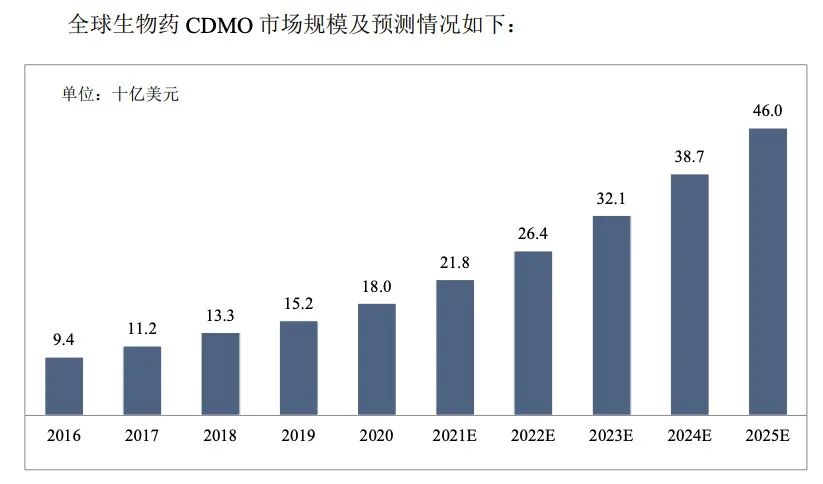 然而新药开发九死一生,业界一直流传着“双十定律”的说法,即开发一款新药平均需要10年、耗资10亿美元,许多企业为了降低风险,节约成本,会选择生物药CDMO企业为其提供工艺研发及生产服务。同时,MAH制度下产、研、销分离,助力生物药CDMO企业获得更多新药合作机会。况且生物药研发热度不减,相对于化药,生物药的复杂性也影响着新药开发的成功率,促使生物药CDMO业务乘势而上。全球生物药CDMO市场从2016年的94亿美元增长至2020年的180亿美元,2016年至2020年的年复合增长率为17.6%。未来受创新生物药上市和生物类似药增加药物可及性的驱动,该市场将继续保持快速增长,预计到2025年将达到460亿美元。2020到2025年的年复合增长率为20.7%。