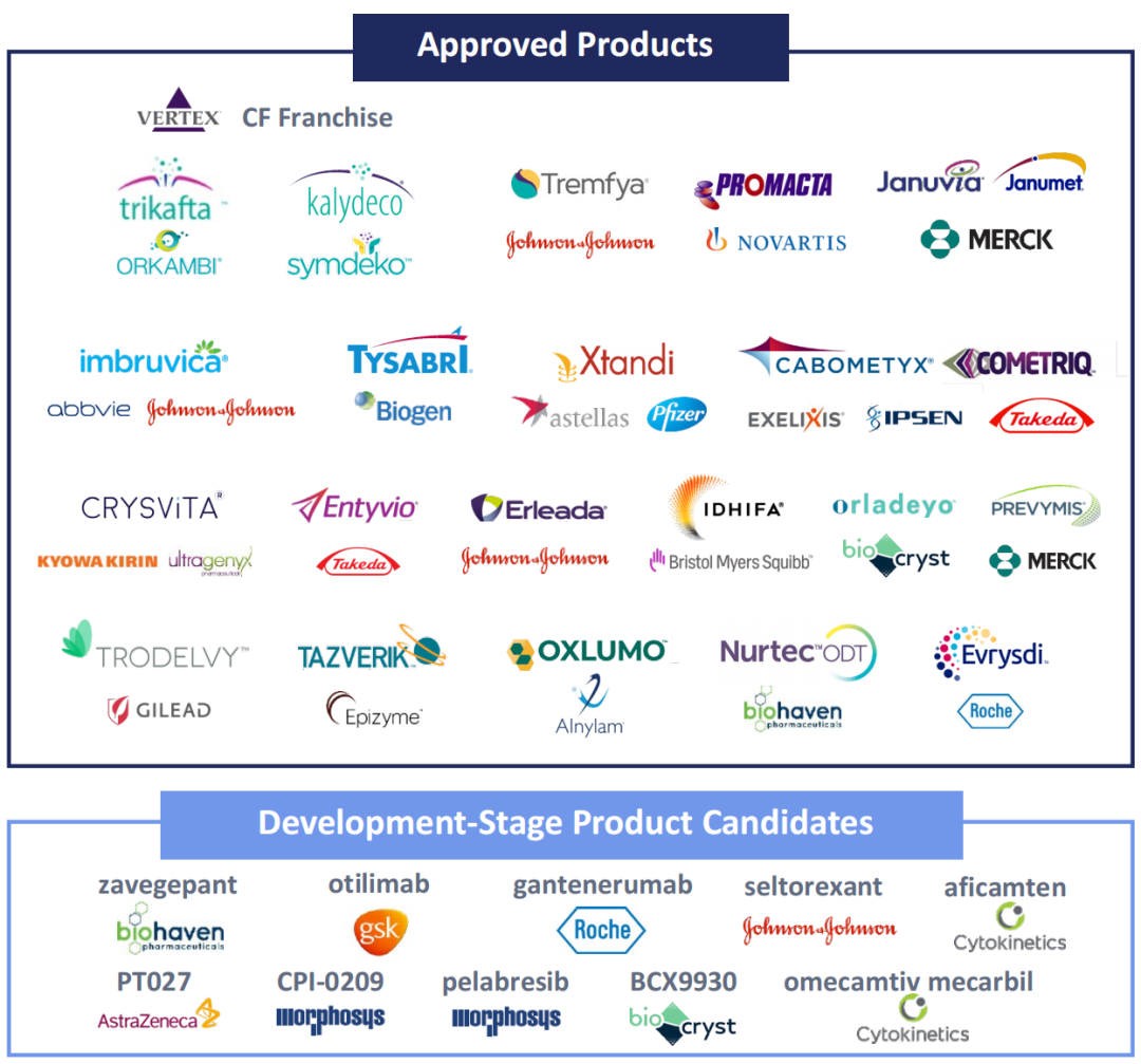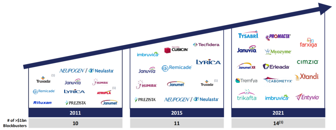 截至2021年底,Royalty Pharma拥有超过35种已商业化药品和10种开发阶段候选产品的特许权(不包括专利到期、协议到期的产品),包括14款年销售额达到10亿美元的重磅炸弹级药物,其中有5款药品年销售额均超过30亿美元。