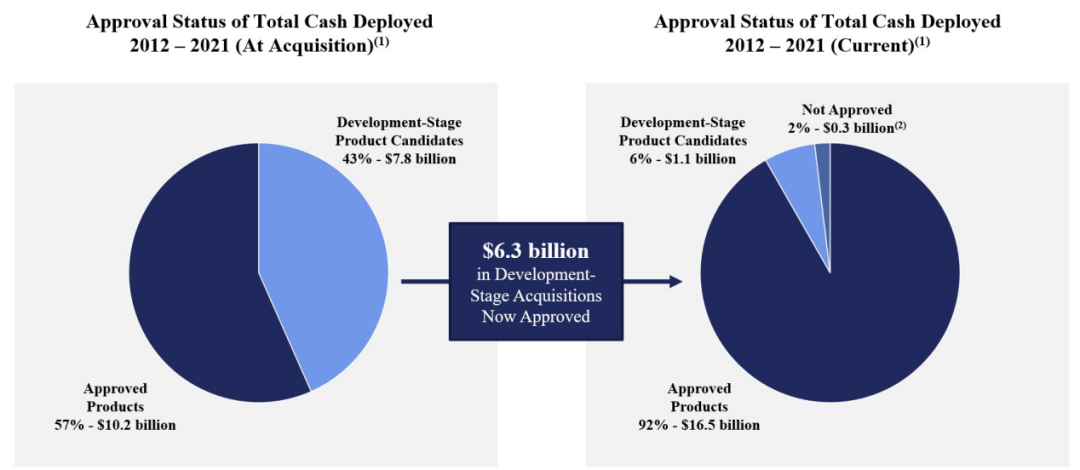 其中,从2012年到2021年,Royalty Pharma部署了78亿美元的资金来投资处于开发阶段候选产品的特许权和里程碑。其中有价值63亿美元的资产已经获批,迄今为止成功率高达81%,有价值3亿美元的资产未获批,价值11亿美元的资产仍在开发中。