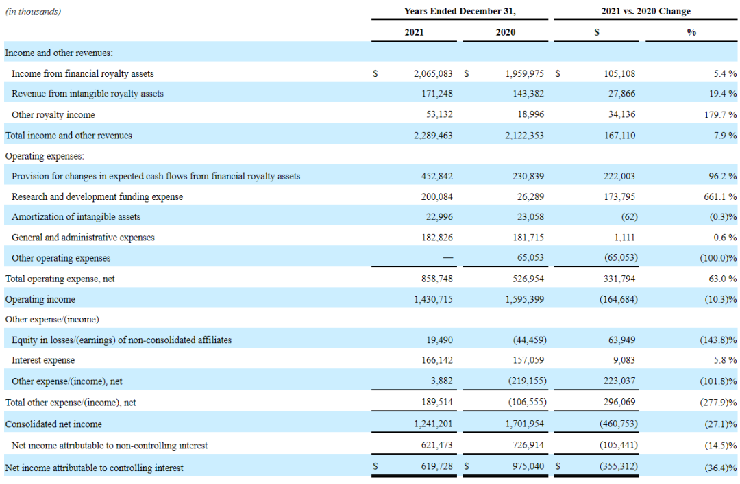 2021年,Royalty Pharma总收入共计22.89亿美元,同比增长7.9%;其中,金融特许权资产收入20.65亿美元,同比增长5.4%,主要受囊性纤维化药物业绩的推动;来自无形特许权资产的收入为1.71亿美元,同比增长19.4%,主要与勃林格殷格翰的一项诉讼有关;其他特许权收入为5313.2万美元,同比增长179.7%,主要受该公司与Biohaven和Immunomedics公司达成的研发筹资协议推动。全年研发资金支出2亿美元,增长661.1%,主要包括了Royalty Pharma从BioCryst和MorphoSys公司购买开发阶段产品特许权而支付的首付款。合并后净利润同比减少27.1%,为12.41亿美元。截至2021年底Royalty Pharma拥有现金及现金等价物15亿美元,有价证券5.819亿美元。