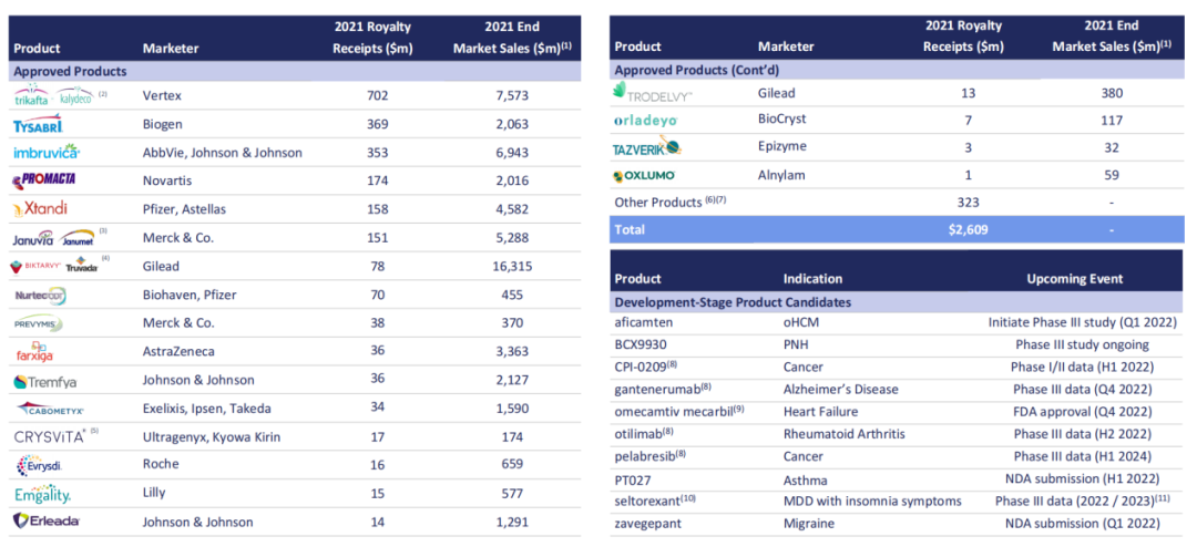 下表为2021年Royalty Pharma投资组合中已上市产品贡献的特许权收入和对应销售业绩,以及在研品种近期的重大事件: