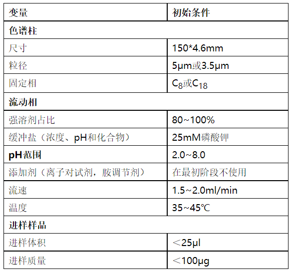 表1.最初阶段的高效液相色谱法分析测试倾向选择的参数