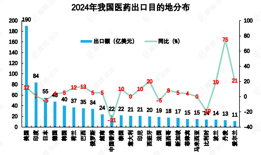 2024年1079.64亿美元的医药产品出口中,出口到美国的仍最多,出口额为190.47亿美元,占了我国医药出口总额的17.6%;其次是东西两个邻国印度、日本,分别出口了83.53亿美元、54.65亿美元,分别占7.7%、5.1%;上述三国(美、印、日)合计出口328.65亿美元,占了我国出口总额的近1/3(30.4%)。