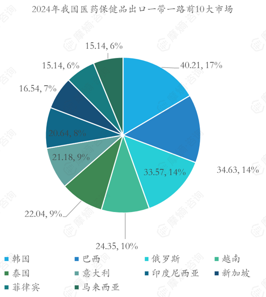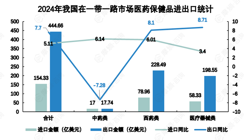 2024年我国对 “一带一路”市场的医药出口额达444.66亿美元,同比增长7.7%。其中西药类出口额228.49亿美元,医疗器械类198.55亿美元,同比增速分别为8.1%和8.71%。