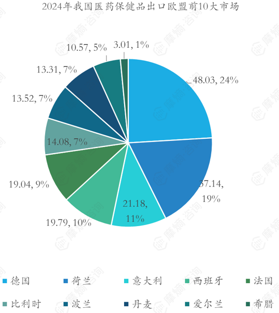 其中德国出口48.03亿元,居于欧盟市场排名第一的市场,其次为荷兰,出口额为37.14亿美元,排名第三为意大利,出口额为21.18亿美元。