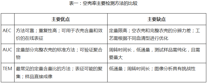 AAV载体由两部分组成:二十面体样的衣壳及其包裹着的单链转基因DNA。在AAV载体组装过程中,会产生三种衣壳:完整衣壳(full capsid)、部分衣壳(partial capsid),和空衣壳(empty capsid)。其中完整衣壳包含正确的DNA序列,是人们所期待的产品;部分衣壳和空衣壳则属于生产中的杂质,有如下几种危害:1), 不仅仅影响产品的纯度,2), 还会增加最终产品的免疫原性,3), 并且会与完整衣壳竞争感染细胞上的载体结合受体,从而抑制完整衣壳的转导,增加总体病毒载量。部分衣壳与空衣壳地存在严重地影响了AAV产品的安全性和有效性,因此监管机构强烈建议在整个生产过程中监控空/完整衣壳比(空壳率)。