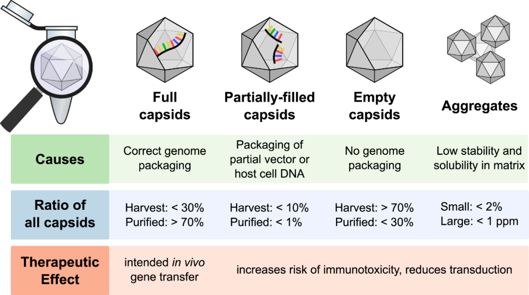 图1 :AAV制备过程中所产生的病毒颗粒类型(图片来源:https://doi.org/10.1016/j.omtm.2021.02.010)