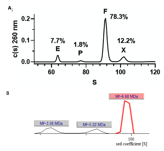 图4|AAV样品的AUC沉降系数分布(数据A源自:DOI: 10.1016/j.omtm.2019.09.006;数据B源自:宜明细胞)。图中各字母代表含义:E (Empty capsid),空衣壳 60s;P (partial capsid),部分完整衣壳60-100s;F, 完整衣壳(Full capsid)100s;X, 不明物