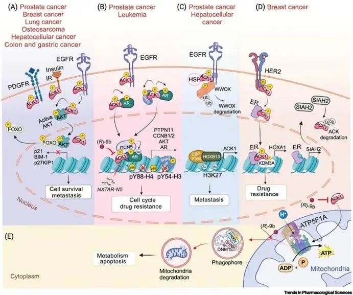 ACK1在多种癌症中过表达或基因扩增,包括前列腺癌、乳腺癌、非小细胞肺癌、胶质瘤、卵巢癌、胰腺癌和结直肠癌等。