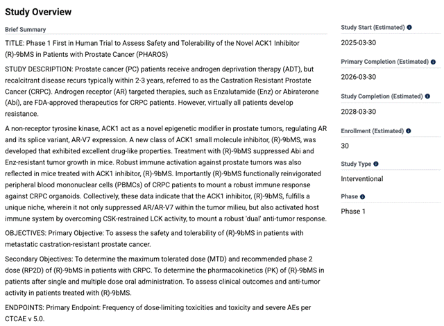 来到当下,TechnoGenesys 于 2025 年 3 月正式启动 (R)-9b 的 1 期临床试验。此次试验旨在评估 (R)-9bMS 对转移性去势抵抗性前列腺癌患者的安全性和耐受性,计划招募 30 名患者,患者需每日口服两次 (R)-9b,最长持续 6 个月,试验预计于明年 3 月公布数据,届时 (R)-9b 的临床潜力将进一步明晰。