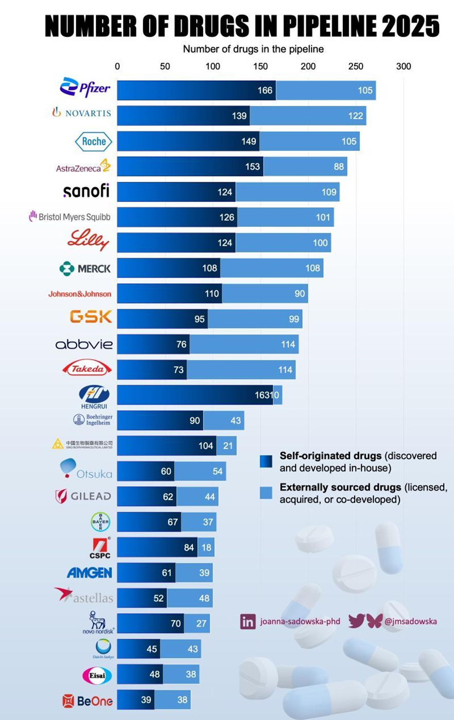 据Joanna Sadowska LinkedIn近期公布的2025年全球制药企业管线资产(包括临床前)排名显示,有恒瑞医药、中国生物制药、石药集团和百济神州4家中国企业上榜,其中恒瑞医药以173个在研项目高居全球第十三位,紧跟武田,公司自研项目高达163个,外部引进仅为10个。这一数字不仅反映出恒瑞强烈的自主创新导向,也体现出其研发团队在肿瘤、自身免疫、麻醉镇痛等多个核心领域的持续深耕。