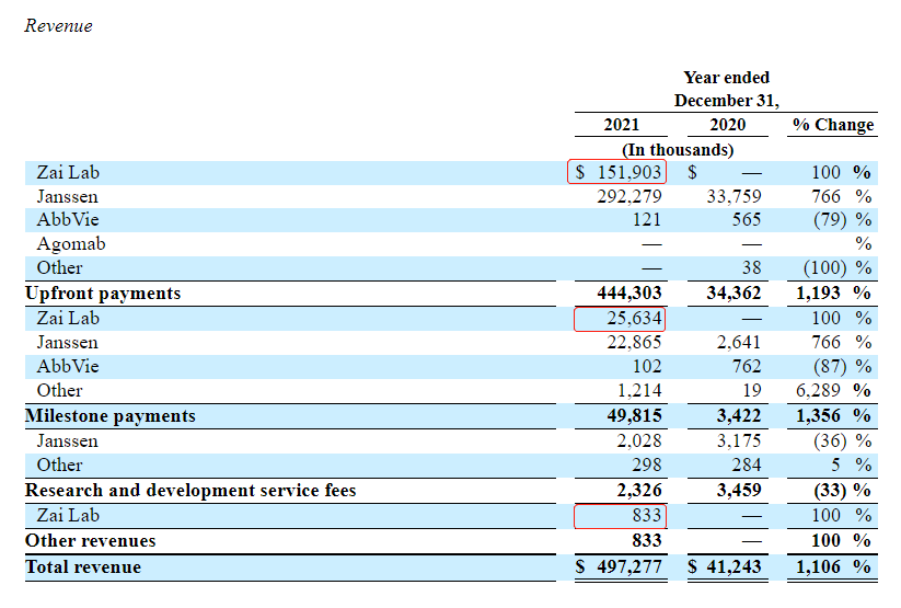 2022年3月3日,argenx发布2021年全年财务业绩报告。截至2021年12月31日,公司现金、现金等价物和流动金融资产总额为23.367亿美元。全年收入增加4.56亿美元至4.973亿美元,主要是因为与杨森的合作协议终止,获得一次性收入3.151亿美元,并从与再鼎医药的战略合作中获得1.775亿美元的收入(首付款+研发费用分摊+产品获批触发的里程碑付款)。