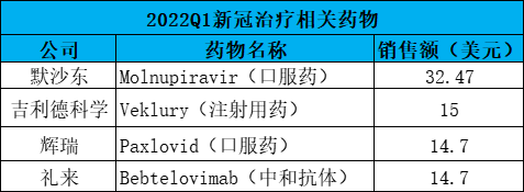 目前已公布的新冠治疗相关药物销售额超过70亿美元,其中辉瑞和默沙东的口服药合计营收近50亿美元。具体如下: