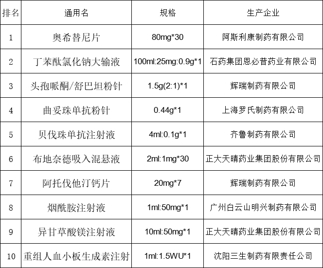 统计网上交易金额前十名药品,结果见下表,阿斯利康奥希替尼片80mg*30规格销售金额排名榜首: