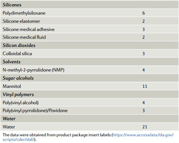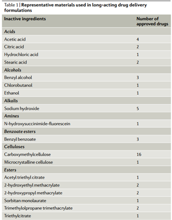 我们发现了60多种用于长效给药制剂的不同材料,最常见的是盐、聚醚、聚酯、水、纤维素、有机硅、聚烯烃、糖醇、酯和酸或碱(表1)。为了控制药物释放,生物可降解制剂通常使用丙交酯和乙交酯(PLG) 的聚酯共聚物,一些使用乳酸和乙醇酸共聚物(聚乳酸-乙醇酸共聚物(PLGA))或聚丙交酯的均聚物)或聚乳酸(PLA);不可生物降解的配方包含聚(乙烯-醋酸乙烯酯)(EVA)、有机硅、聚乙烯和其他聚合物。制剂中存在的其他赋形剂可以通过增加粘度和表面活性剂活性、缓冲pH值和控制渗透压来稳定悬浮液、提供机械强度、实现体内成像和控制其他特性。