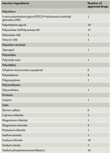 在长效药物制剂的非活性辅料方面,最常用的辅料是盐(15%),多用于调节缓冲液的酸碱度和渗透压,改善产品稳定性或降低给药时的疼痛感;其次常用的是聚醚类辅料(13%),尤其是非离子型表面活性剂吐温80和聚乙二醇(PEG),用于改善疏水性粒子或者微球在水溶液中的分散度;第三常用的是聚酯类辅料(11%),例如PLG、PLGA、PLA等,作为可生物降解的聚合物基质用于控制药物释放;第四常用的辅料是水(9%),用于产品的混悬、增溶、复溶和注射;第五常用的辅料是纤维素(7%),尤其是羧甲基纤维素(CMC),用于增加产品粘度,提供粒子负电位改善混悬粒子的稳定性。其他的辅料还包括硅酮(5%)、聚烯烃(5%)、糖醇(5%)、酯类(4%)、金属(2%)、对羟基苯甲酯(3%)、酸(4%)、碱(2%)、聚乙烯类聚合物(3%)、二氧化硅(1%)和有机溶剂(1%)。