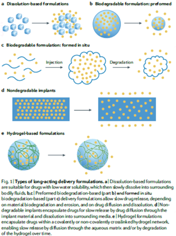 大多数长效给药制剂的设计基于溶解制剂、预制或原位可生物降解系统、不可降解植入物或水凝胶(图1,2)。水溶性低的药物可以加入到基于溶解的制剂中,该制剂在配制时不需要额外的赋形剂来控制药物释放。制剂在数周或数月内缓慢溶解,从而在作为药物悬浮液给药后释放药物。水溶性不够低的药物可以通过化学修饰形成不良在产生药物混悬液之前可溶解、可裂解的前药,或者它们可以与亲脂性抗衡离子结合以降低整体药物溶解度。药物可以被包埋(或微囊化)在可生物降解的聚合物中,因此药物释放受药物通过聚合物基质的扩散、聚合物基质的生物降解和侵蚀、聚合物溶胀和渗透诱导事件控制,或者在某些情况下,通过与聚合物基质的组分结合或聚合物链迁移以修复,先前打开的封闭孔。这种可生物降解的制剂可以预先形成,例如作为悬浮液注射的载药微粒,或通过注射后在体内硬化而原位形成。不可降解制剂通常是宏观尺寸的植入物,可以在使用后去除。植入物可以适应高载药量并促进药物释放机制,从而延长给药时间。这些制剂通常通过药物扩散通过聚合物基质来控制释放。最后,基于水凝胶的制剂是基于水的系统,它有利于药物稳定性和生物相容性。