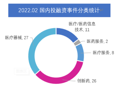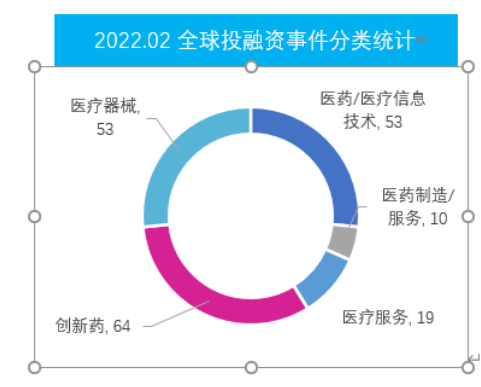 国内创新药的快速发展,除了政策利好,资本的推动也是重要因素之一。据药融云数据统计,2022年2月全球医药大健康行业共发生投融资事件199起,与上月数量比较减少26%,其中创新药类有64起,为融资热度TOP1,医疗器械和医药/医疗信息技术类均为53起,并列融资热度TOP2。