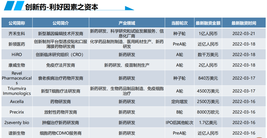 对于创新药大类,本月国内一级市场对基因治疗/基因编辑以及细胞免疫疗法两个方向尤为关注,包括凌意生物、神济昌华、尧唐生物、英百瑞、烁星生物等在内的多个企业获得资本支持,总体来看,生物药受关注度更高。