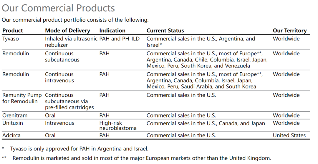 AdCirca是一种PDE-5抑制剂,其有效药物成分为他达拉非。他达拉非也是礼来公司(Lilly)销售的Cialis的活性药物成分,用于治疗勃起功能障碍。2021年AdCirca产品净销售额为5590万美元,2020年为6730万美元,2019年为1.072亿美元,分别占各财年营业收入的3%、4%和7%。2009年,FDA批准AdCirca的推荐剂量为40毫克,使其成为唯一一种用于治疗PAH每天一次的PDE-5抑制剂。2018年8月,Mylan(迈兰公司)宣布推出其仿制药,这对AdCirca的净产品销售造成了不利影响。