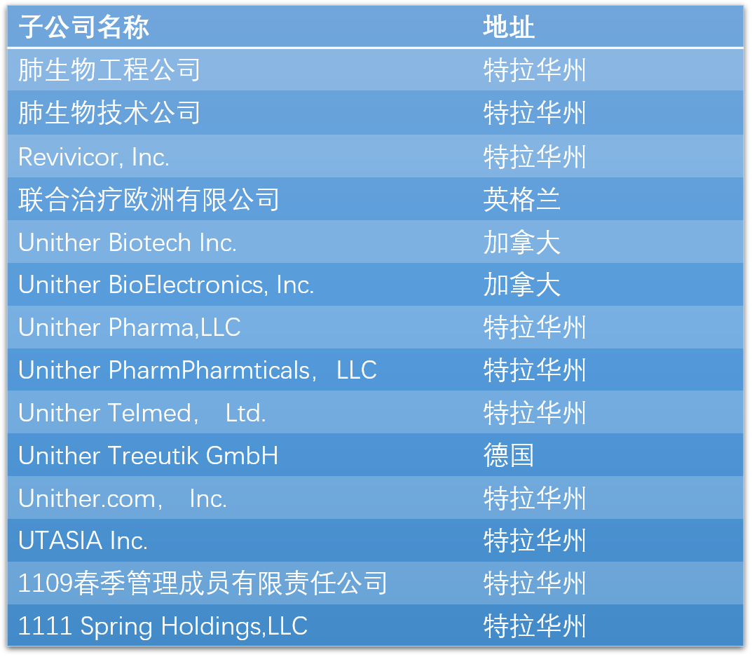 发展至今,United Therapeutics 已拥有约15家子公司:
