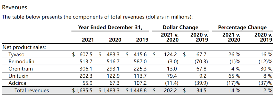 1.与2020年相比,2021年Tyvaso、Remodulin和Orenitram的净产品销售额增长了1.342亿美元。这3种产品属于treprostinil(曲前列尼尔)类产品。