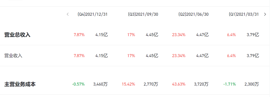 2021财年第二季度实现最高营业总收入,为4.47亿美元,同比增长23.34%,其次是三季度营业总收入为4.45亿美元,同比增长17%。