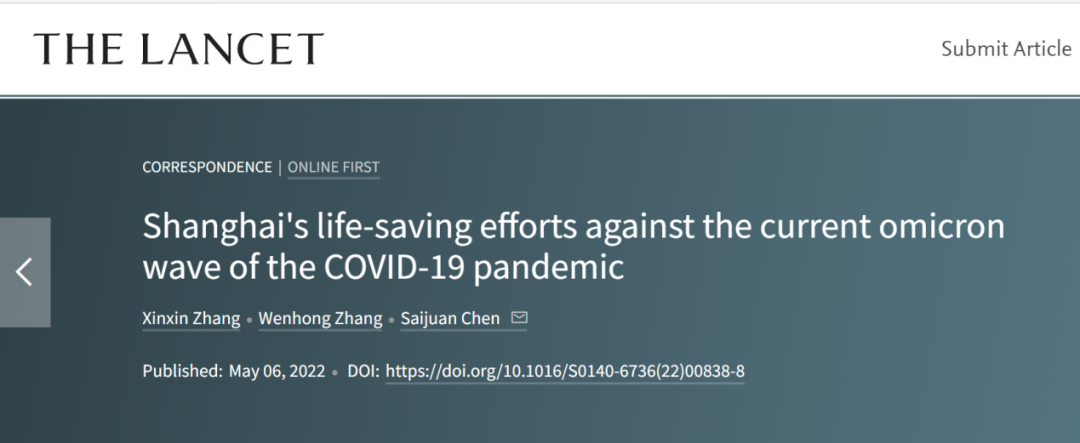 2022年5月6日,上海交通大学医学基因组学国家重点实验室陈赛娟院士、复旦大学附属华山医院张文宏,以及上海交通大学医学院附属瑞金医院张欣欣教授,在国际顶尖医学期刊《柳叶刀》上发表了题为:Shanghai’s life-saving efforts against the current omicron wave of the COVID-19 pandemic(上海应对当前新冠奥密克戎疫情:拯救生命的努力)的文章[2]。