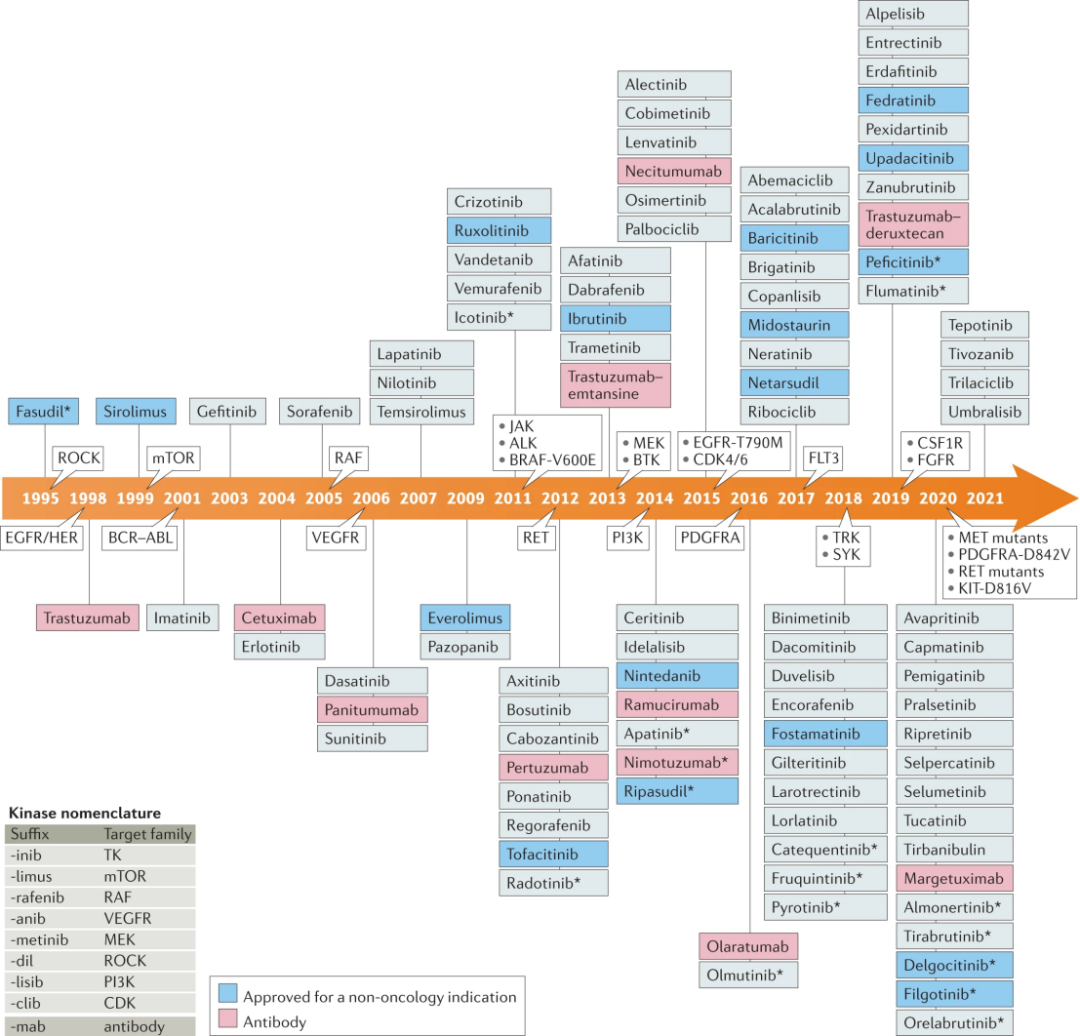 - 2021年,VEGFR抑制剂被批准用于肾细胞癌,第一个针对MET突变型的药物capmatinib, tepotinib被批准用于肺和甲状腺癌。第一个获准用于肺癌术后早期辅助治疗的激酶抑制剂奥希替尼(osimertinib)。MEK抑制剂赛鲁美替尼获批用于治疗儿童1型神经纤维瘤病。