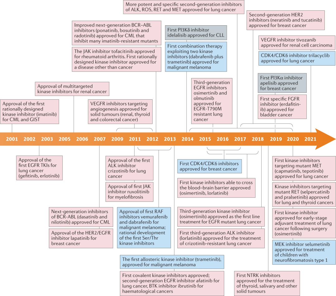 - 2001年,第一个激酶抑制剂伊马替尼(靶向BCR-ABL),被批准用于治疗于慢性粒细胞白血病(CML)和胃肠道间质瘤(GIST)。尽管法舒地尔(RHO依赖性蛋白激酶的抑制剂)和雷帕霉素(西罗莫司,蛋白激酶TORC1的抑制剂)在伊马替尼之前就被批准,但他们都是在不知道其靶蛋白的特性的情况下开发和批准的。所以伊马替尼是第一种通过靶向特定蛋白激酶来治疗待批准的疾病的药物,可谓意义重大。2007年,第二代BCR-ABL抑制剂达沙替尼和尼洛替尼被批准用于治疗CML。2012年第三代BCR-ABL波纳替尼、波沙替尼和拉多替尼被批准用于产生伊马替尼耐药突变的CML。