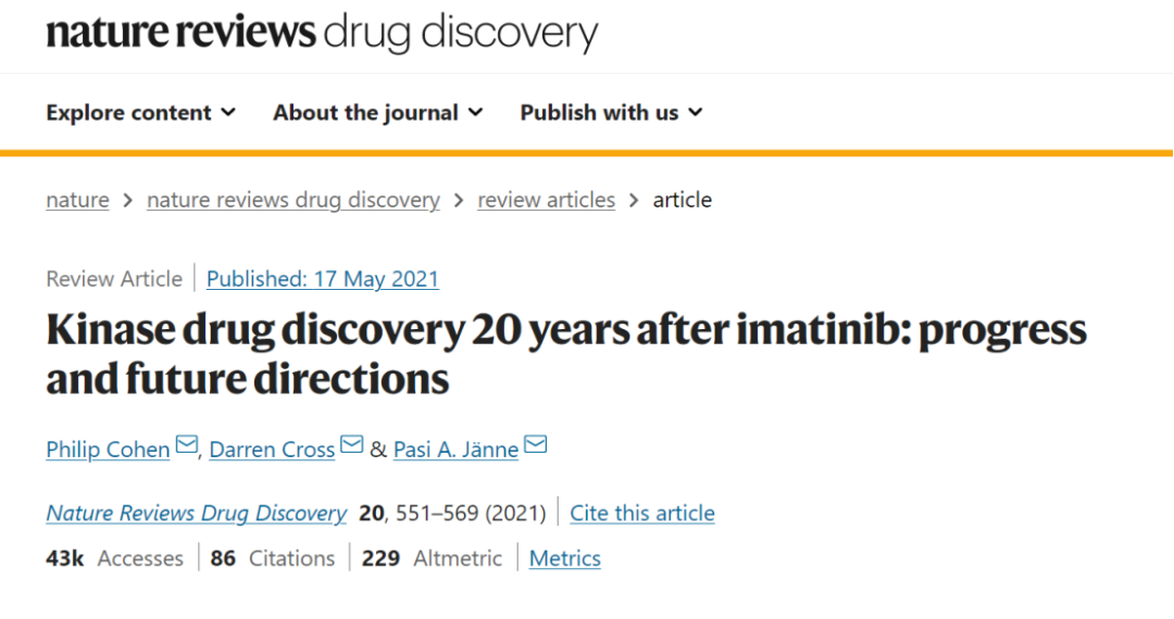 自2001年伊马替尼获得批准以来,全球批准了70多个激酶类新药。这些分子对现在治疗癌症和非癌症疾病的方式产生了重大而深远的影响。在这篇文章里,作者也指出了激酶类药物面临的耐药性的挑战以及激酶药物发现的未来。