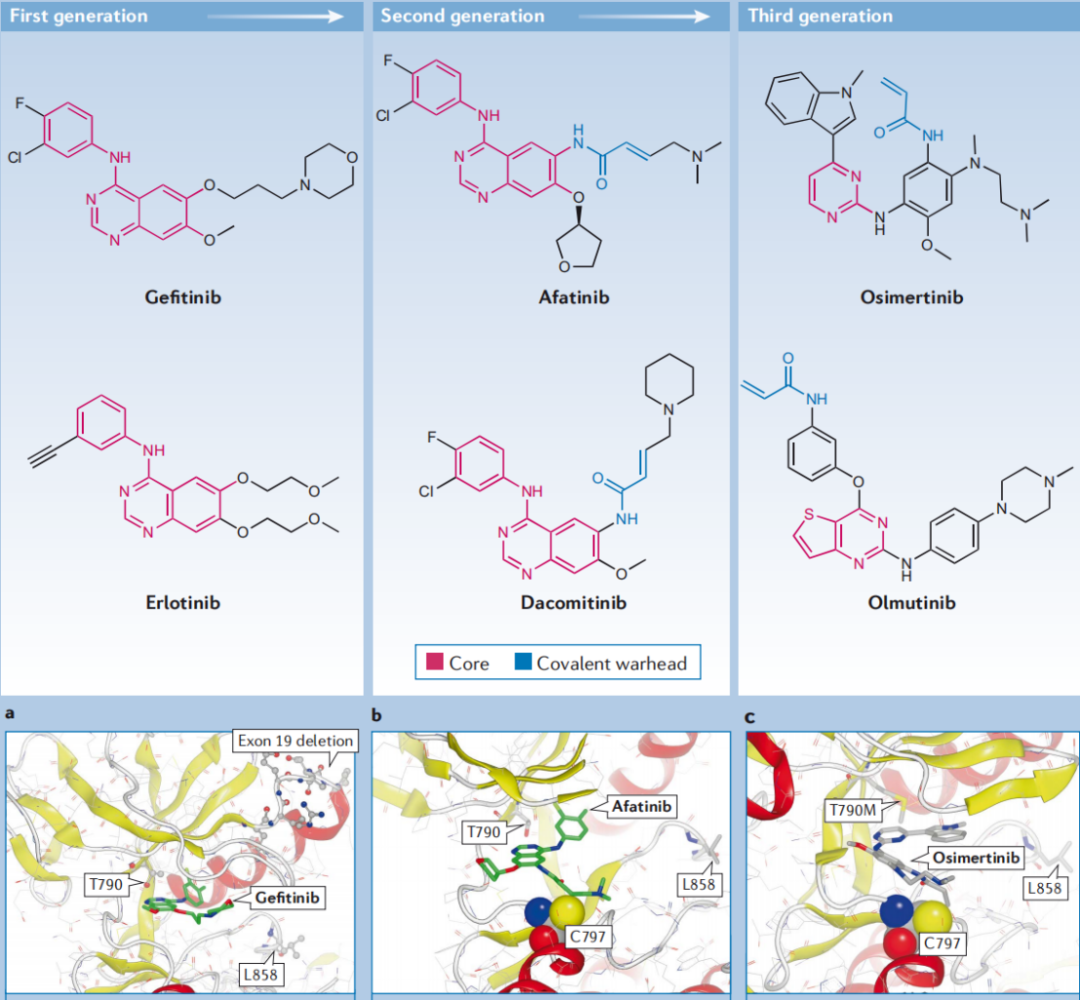 以EGFR抑制剂为例,第一代激酶抑制剂具有苯胺喹唑啉核心主干结构,并与ATP可逆结合,有效抑制EGFR催化活性。第二代抑制剂在喹唑啉的核心结构的基础上增加了一个共价弹头,使不可逆结合,药效上有所增加,但也增加了毒性。第三代抑制剂,抛弃了二代抑制剂的喹唑啉基结构,采用嘧啶核心主干和共价弹头结合的结构,克服了EGFRT 790M突变,这使得第三代抑制剂能克服一代抑制剂的获得性耐药。
