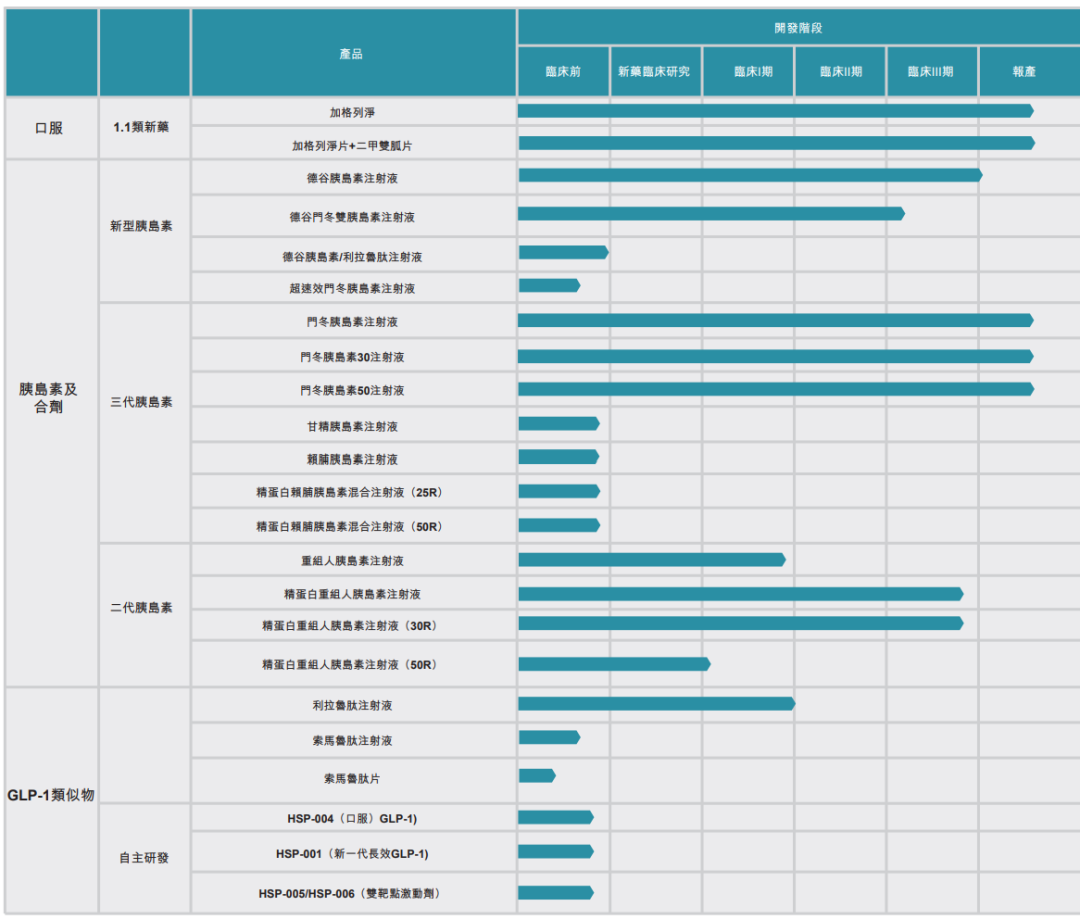 - 惠升生物是四环医药旗下专注糖尿病及并发症领域的生物医药公司,已有7年历史,其研发团队逾200人。有丰富的糖尿病药物研发经验和40余款产品的产品管线,涵盖了二代、三代、四代胰岛素(覆盖基础、预混及速效产品)、各类口服降糖药、DPP4、GLP-1及SGLT-2等新靶点及并发症用药等,是目前国内唯一实现糖尿病及併发症领域全产品覆盖的公司。其中,门冬胰岛素注射液、门冬胰岛素30注射液及门冬胰岛素50注射液NDA已获国家药监局受理,创新药加格列淨准备递交NDA;第四代德谷胰岛素注射液、德谷门冬双胰岛素注射液等重磅管线,临床进展迅速。