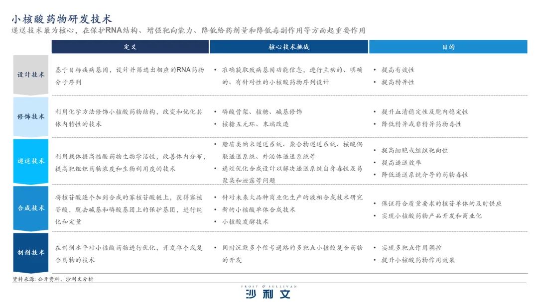 小核酸药物面临如何高效进入靶细胞、释放到细胞质、并高效长效发挥作用等问题。小核酸药物研发过程中的不同问题需要相应的技术加以解决。按照小核酸药物研发流程的顺序,核心技术分为设计、化学修饰、递送、合成及制剂技术。最关键的核心技术是核酸药物递送技术。药物递送在保护RNA结构、增强靶向能力、降低给药剂量和降低毒副作用等方面起重要作用。