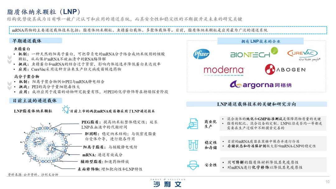 mRNA药物的主要递送载体技术包括脂质体纳米颗粒、鱼精蛋白载体、多聚体载体等。目前,脂质体纳米颗粒是应用最为广泛的递送系统。最新一代的可离子化脂质纳米粒颗粒,在低pH值的环境中携带正电荷,与mRNA形成复合体,提高mRNA稳定性,在生理pH值时为中性,这减少了它与血液中细胞的细胞膜之间的相互作用,降低脂质毒性。在被细胞摄入后,内体的酸性环境让它们重新携带正电荷,这可能帮助破坏内体细胞膜的稳定性,促进mRNA从内体的脱离。LNP还携带其它脂质分子,包括磷脂、胆固醇、以及聚乙二醇(PEG),这些脂质分子可以帮助改善LNP的稳定性、递送效率、耐受性和生物分布等重要特征。可离子化LNP缺陷在于其仍然会导致炎症细胞因子的释放,缺乏靶向能力,脂质体的稳定性差。对LNP的安全性和稳定性的不断提升是未来的研究关键。(相关阅读:《一文窥探mRNA公司主流核心专利技术——LNP递送技术》)