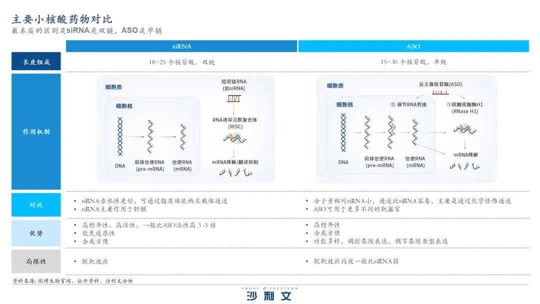 小核酸药物,即寡核苷酸药物,是由十几个到几十个核苷酸串联组成的短链核酸,作用于pre-mRNA或mRNA,通过干预靶标基因表达实现疾病治疗目的。目前小核酸药物主要包括siRNA药物和ASO药物。