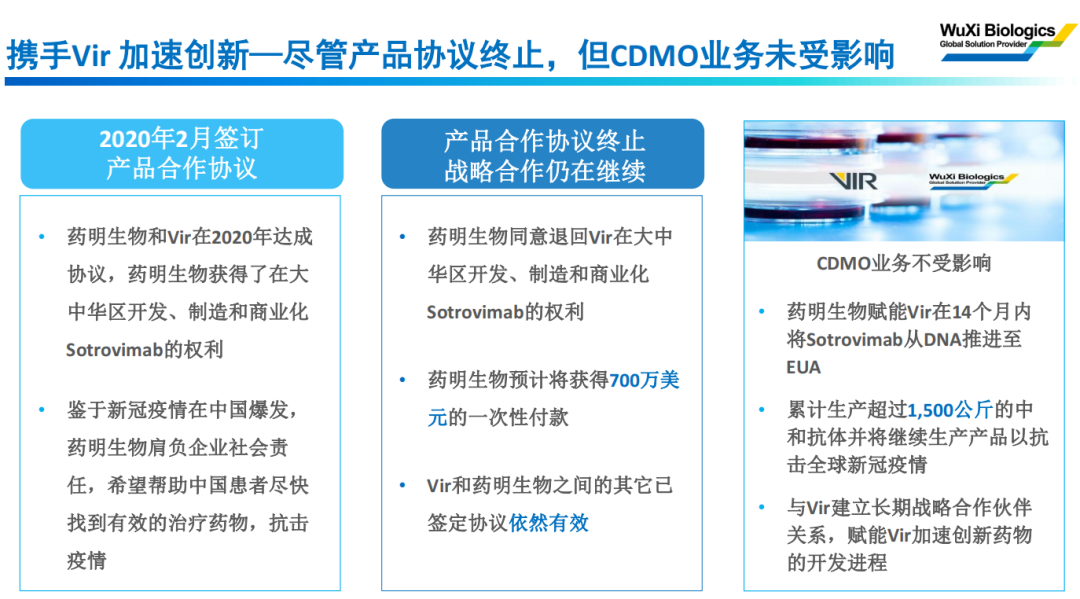 2020年2月签订产品合作协议。药明生物和Vir在2020年达成协议,药明生物获得了在大中华区开发、制造和商业化Sotrovimab的权利。