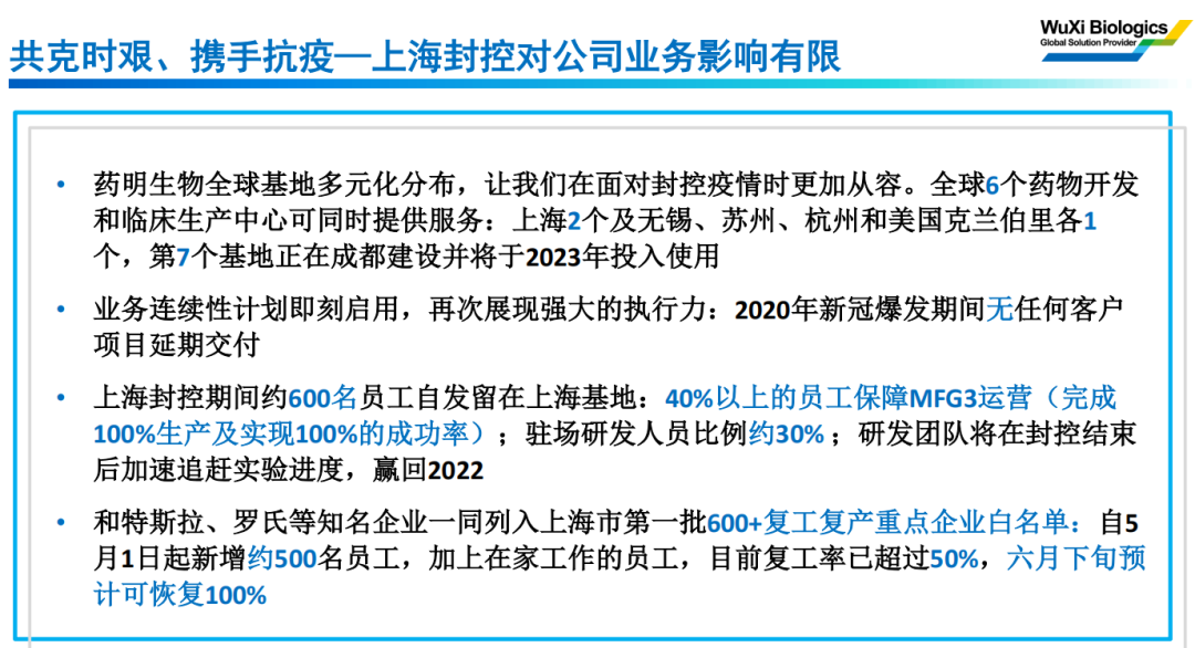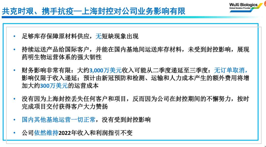 药明生物表示:上海封控对公司业务影响有限。公司依然维持2022年收入和利润指引不变。