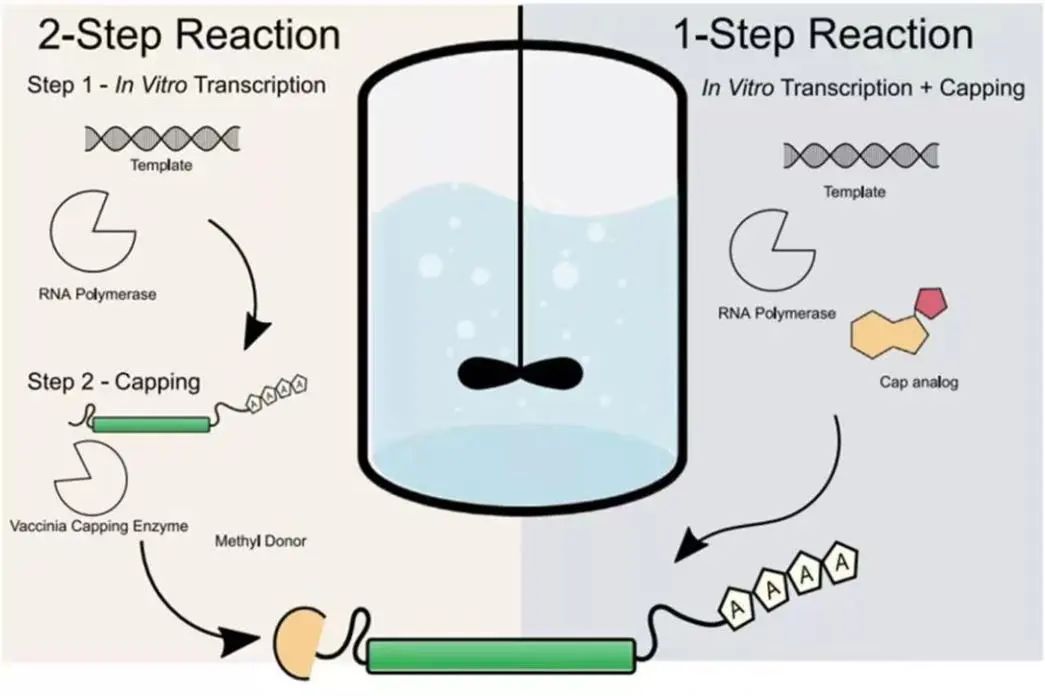 体外转录合成(IVT)是一个相对复杂的酶催化过程。在合成mRNA的过程中,除DNA模板外,科研人员还需加入所需的酶、核苷酸及其它相关试剂。为了保证工艺稳定性,研发人员通常采用实验设计法(DoE)进行工艺优化和规模逐级放大(比如从1mL-50mL-500mL-5L的放大路径),以实现产量的稳步提升。