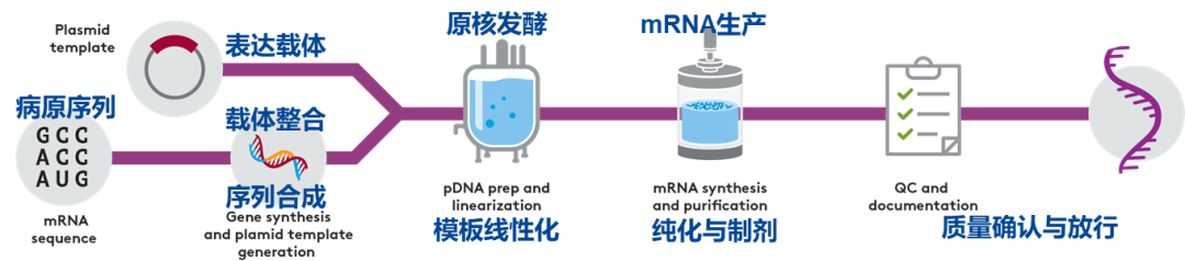 mRNA生产工艺主要包括质粒原液生产、mRNA原液生产、mRNA制剂制备与纯化、质检及储存运输。mRNA自身存在精准合成难度高、易降解、难保存等特性,使得mRNA药物在研发生产过程控制、工程保证、大规模制备工艺、质量控制与质量体系等多方面存在复杂挑战。