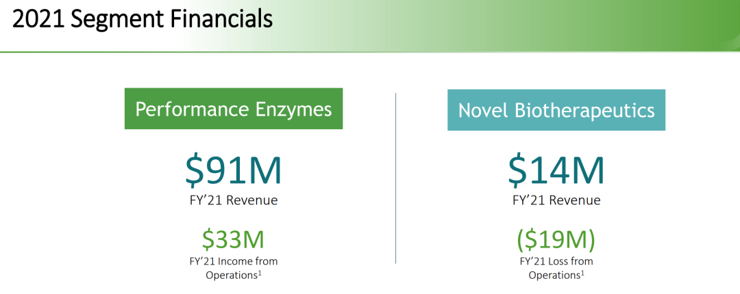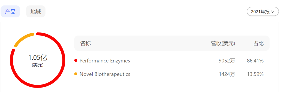 2021年年报显示,Codexis公司盈利来源于两大板块。其一是功能性酶,实现营收9025万美元,占总营收的86.41%;Codexis的另一大盈利来源是新的生物疗法,营收1424万美元,占比13.59%。