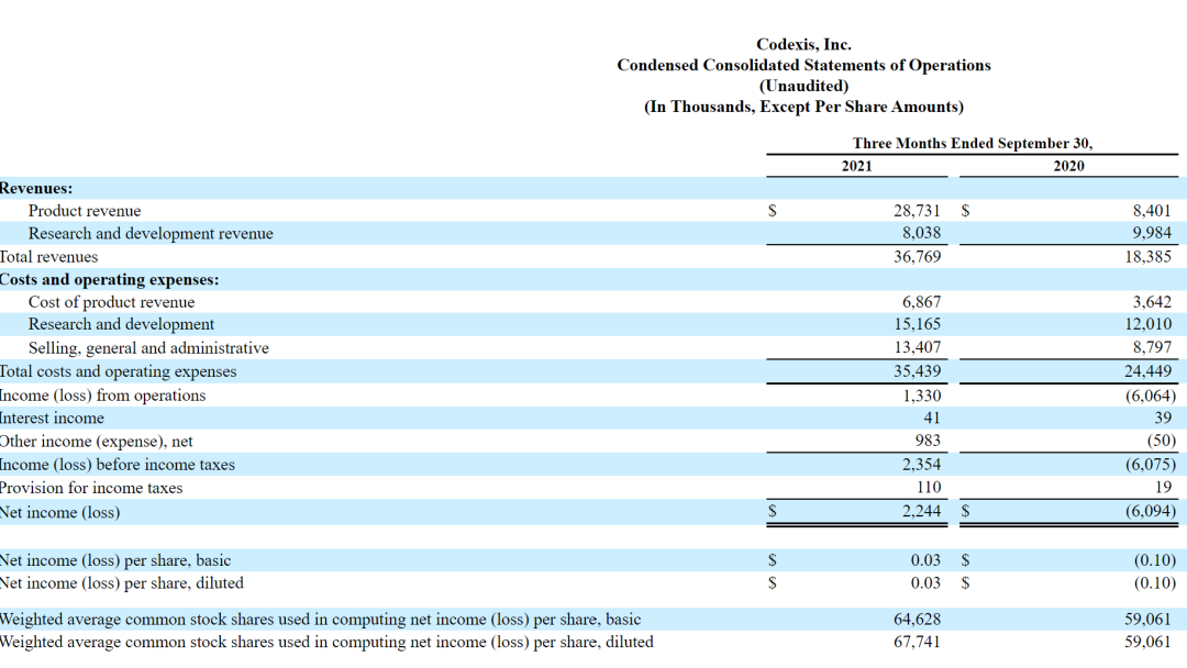 (二)2021年11月6日,Codexis发布2021年三季度报: