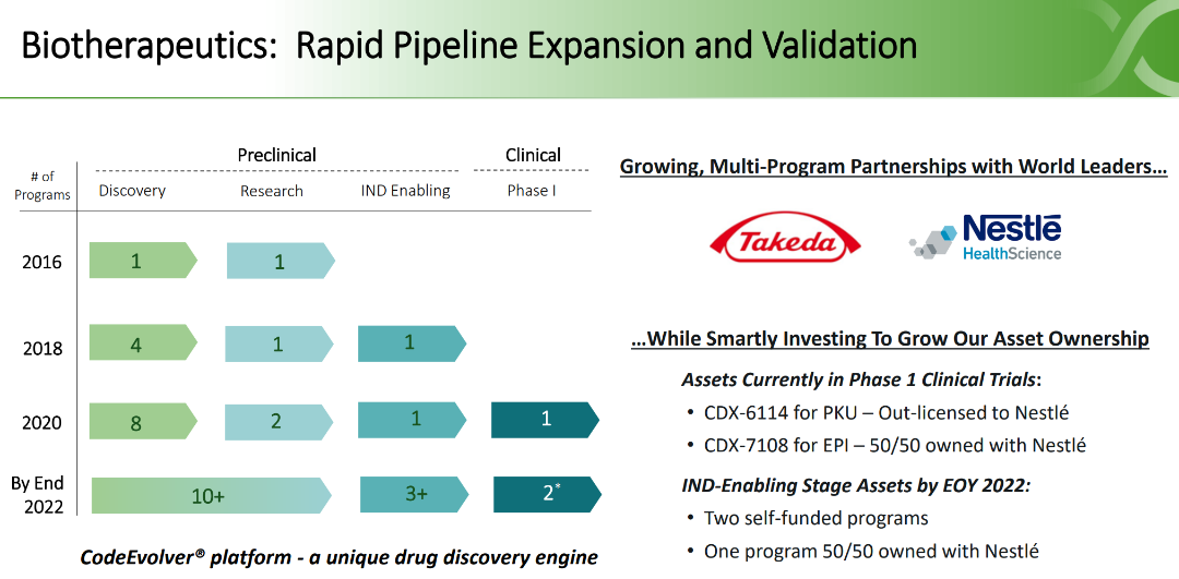 2017年10月,Codexis与与Nestlé Health Science合作CodeEvolver平台技术,为Nestlé Health Science建立的消费者护理和医疗营养业务领域开发其他新型酶。协议的期限Nestlé SCA已经延长到2022年12月。2020年1月,Codexis和Nestlé Health Science达成了一项开发协议,根据协议,Codexis和Nestlé Health Science正在合作推进CDX7108,这是一种通过Nestlé SCA发现的针对胃肠道疾病的领先候选药物,进入临床前和早期临床研究。